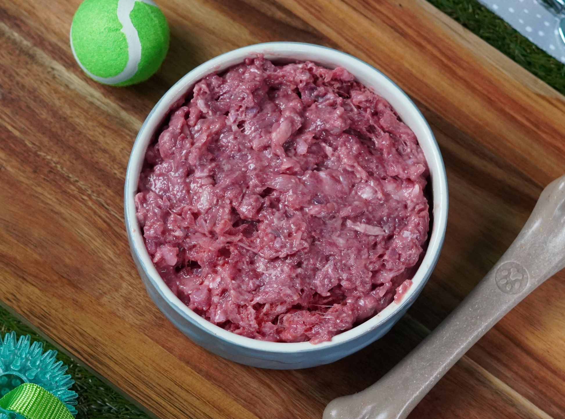 90% chicken and 10% chicken offal with no added water, preservatives or additives. 10-15% natural bone content