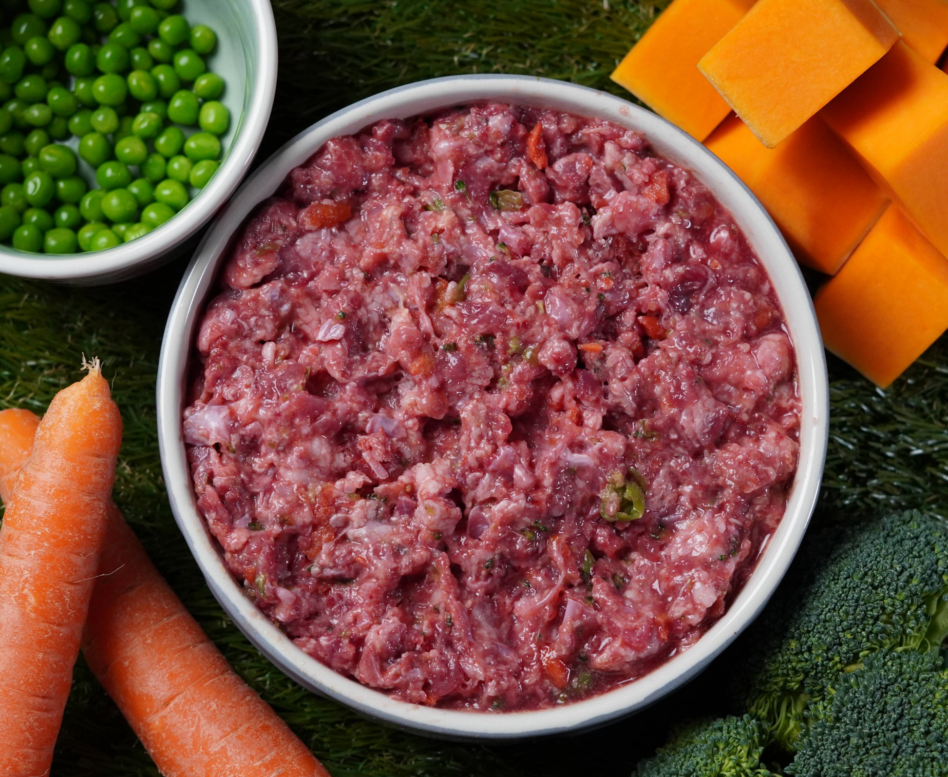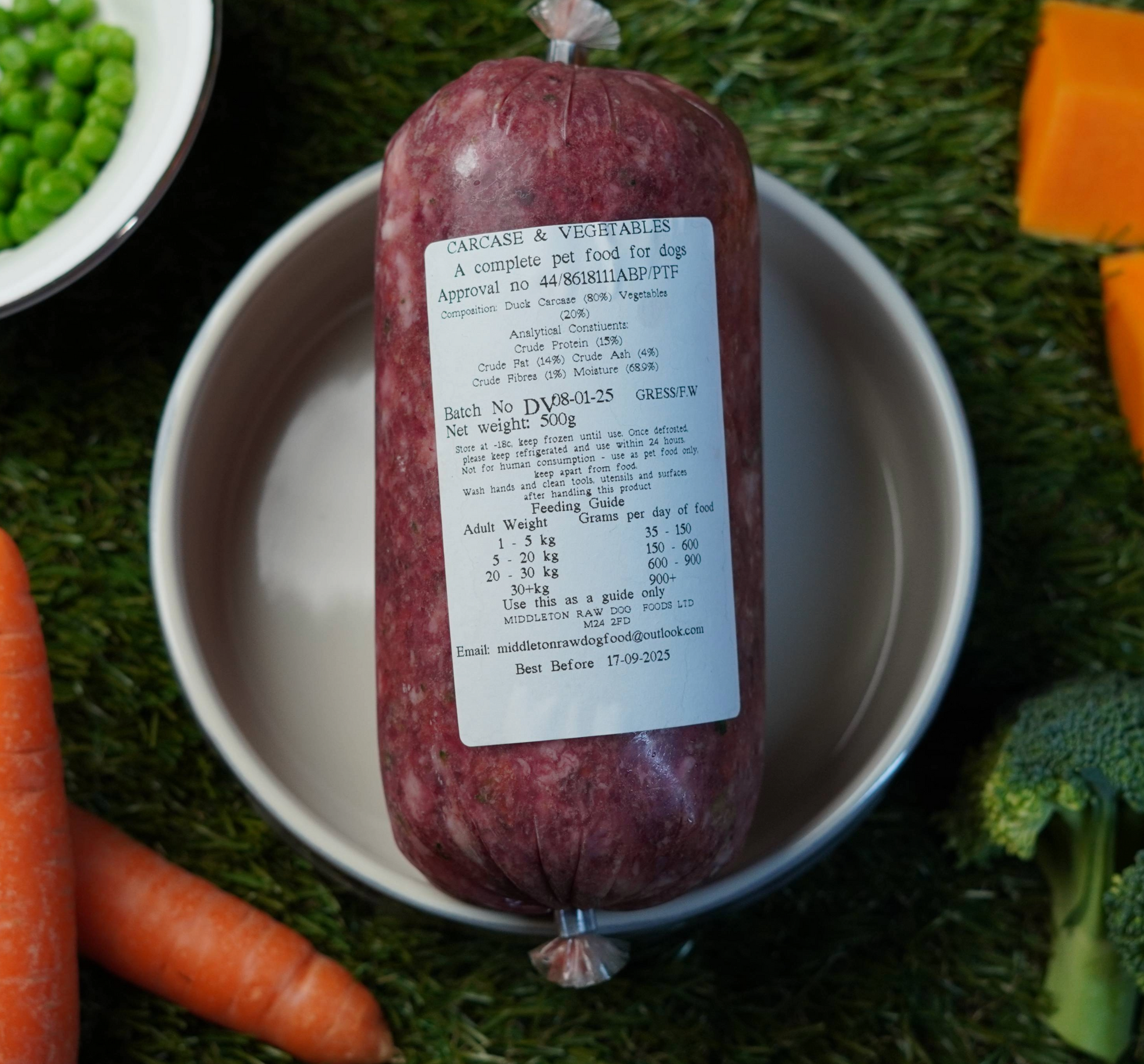 80% duck and bones 20% vegetables with no added water, preservatives or additives, 10-15% natural bone content for the essential calcium.